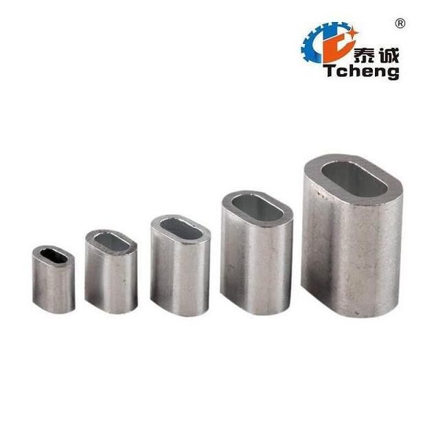 鋼絲繩鋁套—鋁套是鋁材質(zhì)的,較輕,用來固定鋼絲繩兩端的頭的,鋼絲繩根據(jù)需要的掛圈大小,插入鋁套,然后放入壓套機模具內(nèi),(根據(jù)鋁套型號對應(yīng)壓套機模具,模具型號跟鋁套型號都是標準尺寸),壓制完,把兩邊擠壓出來的鋁廢料清理掉,一根鋼絲繩完成!