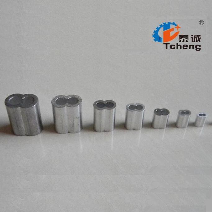鋼絲繩鋁套—鋁套是鋁材質(zhì)的,較輕,用來固定鋼絲繩兩端的頭的,鋼絲繩根據(jù)需要的掛圈大小,插入鋁套,然后放入壓套機(jī)模具內(nèi),(根據(jù)鋁套型號(hào)對(duì)應(yīng)壓套機(jī)模具,模具型號(hào)跟鋁套型號(hào)都是標(biāo)準(zhǔn)尺寸),壓制完,把兩邊擠壓出來的鋁廢料清理掉,一根鋼絲繩完成!